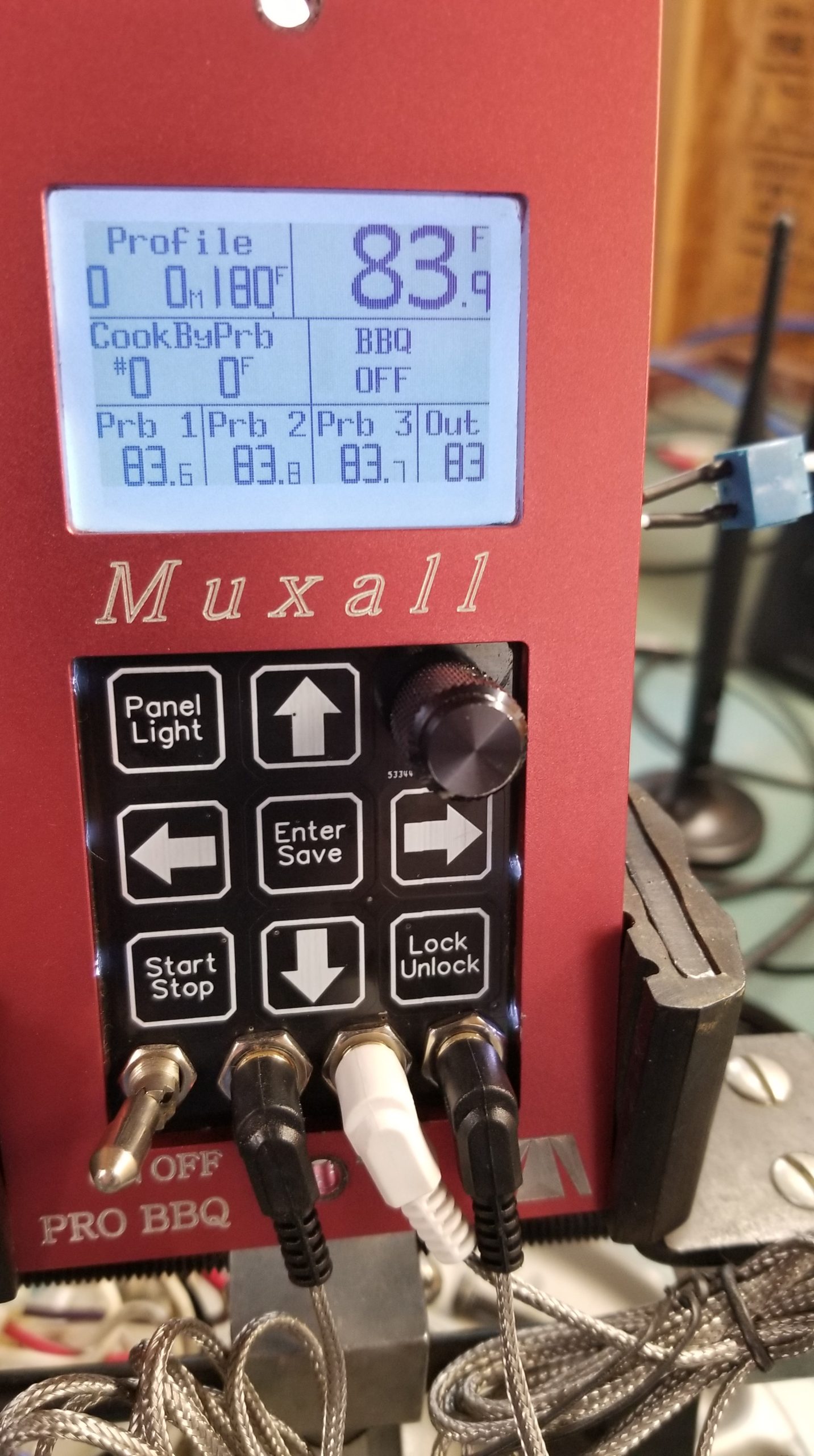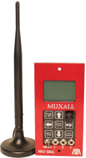 Red Muxall Pro BBQ Controller V5 with an external antenna.